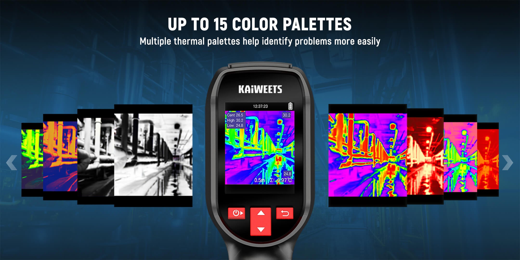 15 Thermal Palettes for Enhanced Analysis: Outperform rivals with triple the color palette options (vs. 5-7 standard). The KTI-200 IR camera offers 15 thermal palettes (e.g., White Hot, Rainbow, Iron Red) to optimize visibility and identify problems more easily.