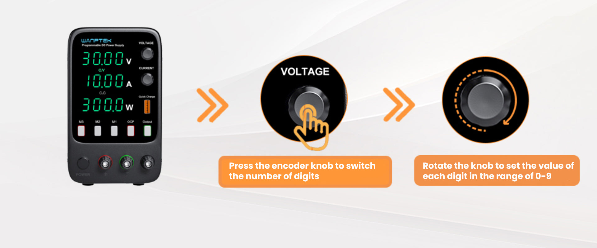 Präziser Encoder-Einstellknopf: Das Gleichstromnetzteil verfügt über einen präzisen Encoder-Einstellknopf. Drücken Sie einfach den Knopf, um jede Ziffer umzuschalten, und drehen Sie dann den Knopf, um jede Ziffer im Bereich von 0 bis 9 einzustellen. Im Gegensatz zu herkömmlichen Drehknöpfen können Sie mit dem Kodierknopf dieses variablen Gleichstromnetzteils die benötigten Einstellungen genauer vornehmen.