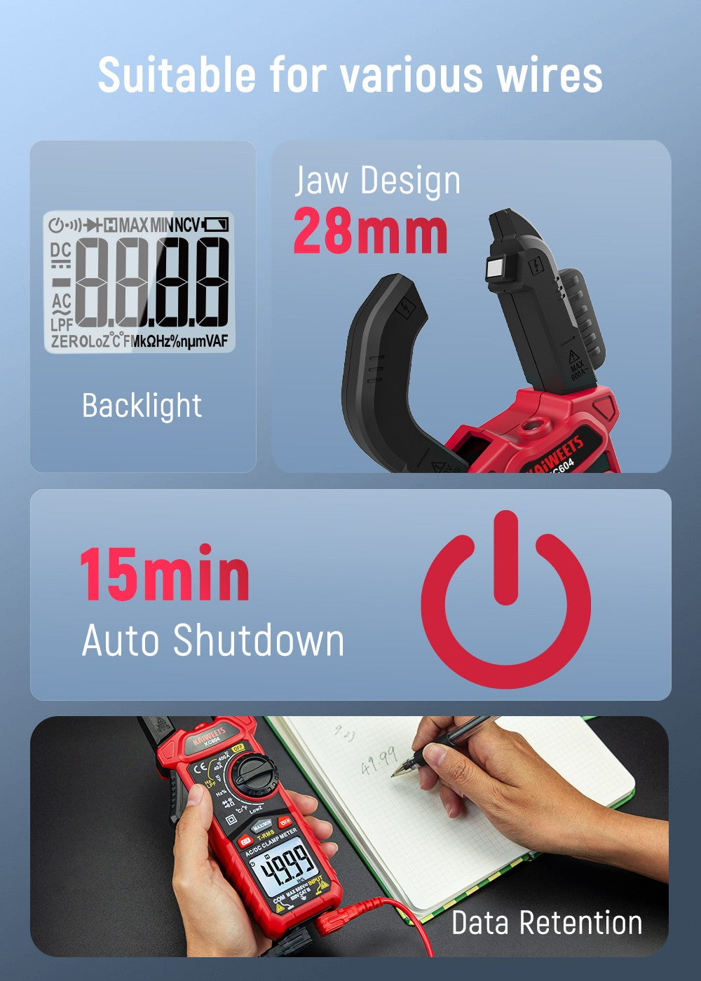USER FRIENDLY: With test lead storage, meter leads can be protected and stored when not in use. The LCD backlight screen and flashlight ensure clear readings, even in dimly lit areas. Additionally, the low battery indicator shows the battery status and reminds you to replace it promptly. To save power, the ammeter automatically shuts off after 15 minutes of inactivity.
