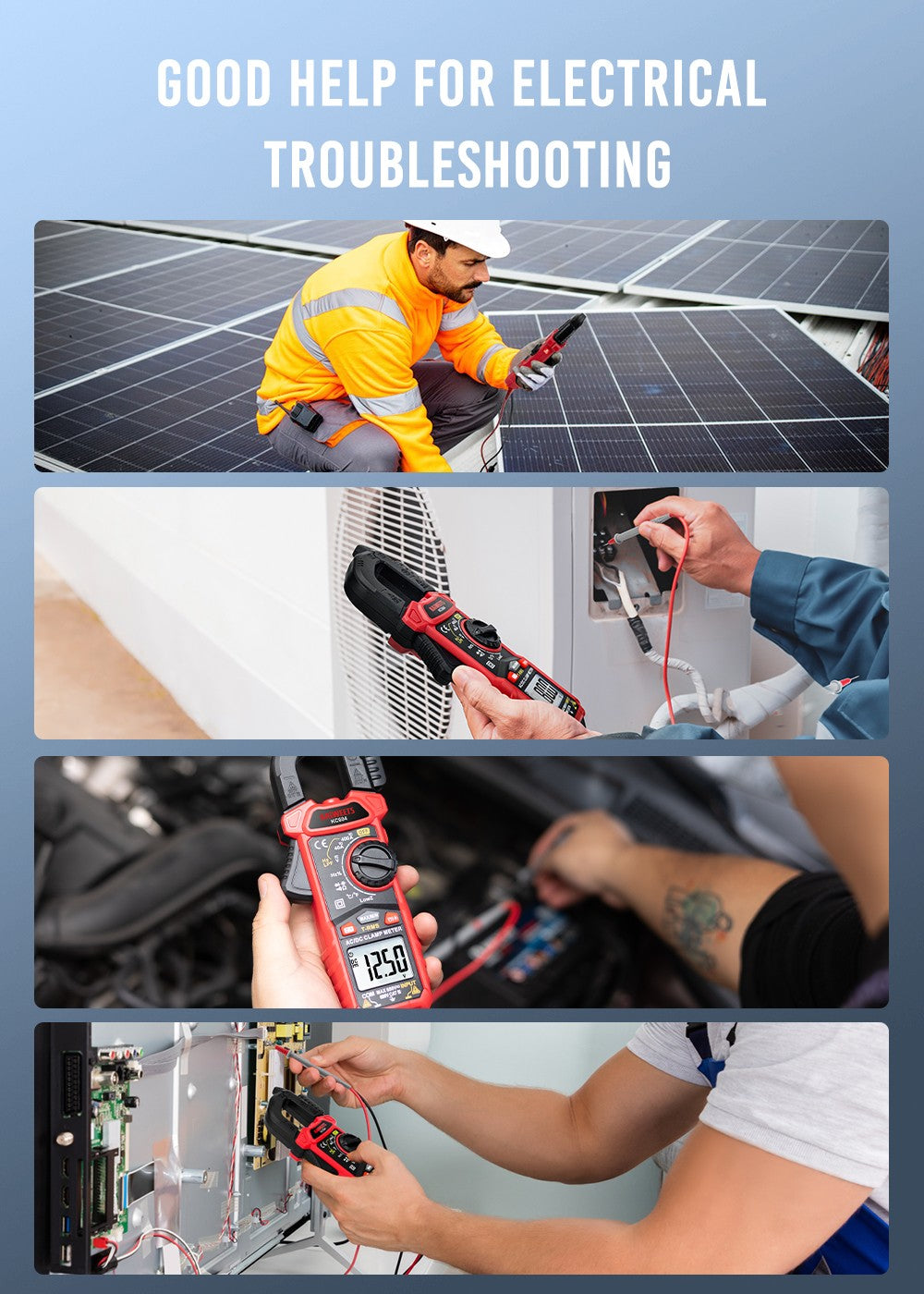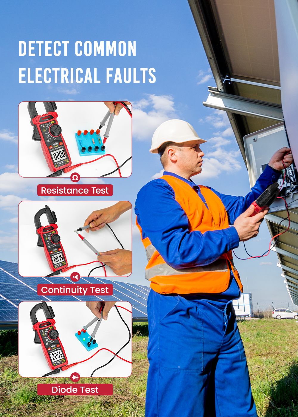 TRUE-RMS AC DC CLAMP METER: This multimeter can accurately measure AC/DC current, AC/DC voltage, temperature (thermocouple included), NCV, capacitance, frequency, resistance, continuity and diode. Good help for troubleshooting the household solar system, automotive and industrial electrical issues, perfect for electricians, DIY, professionals, etc.