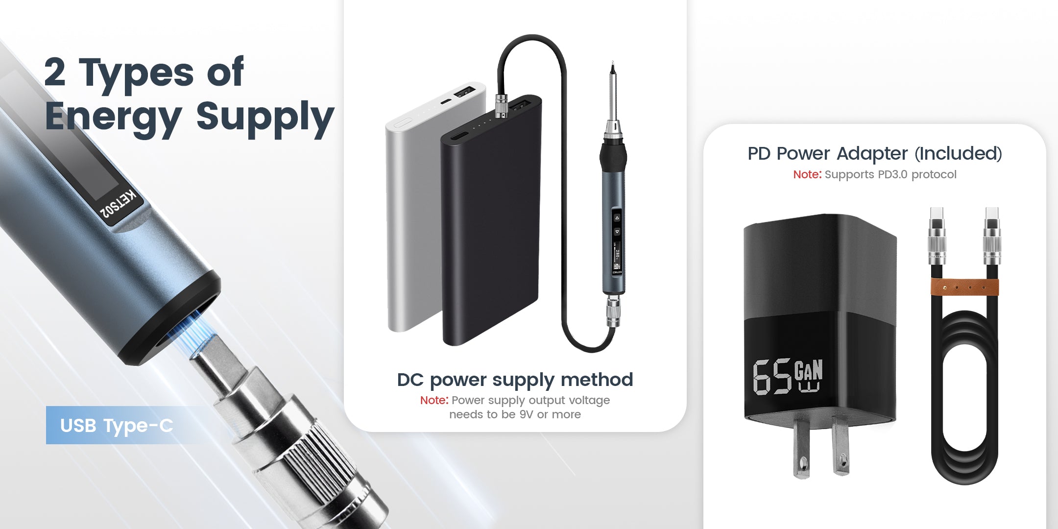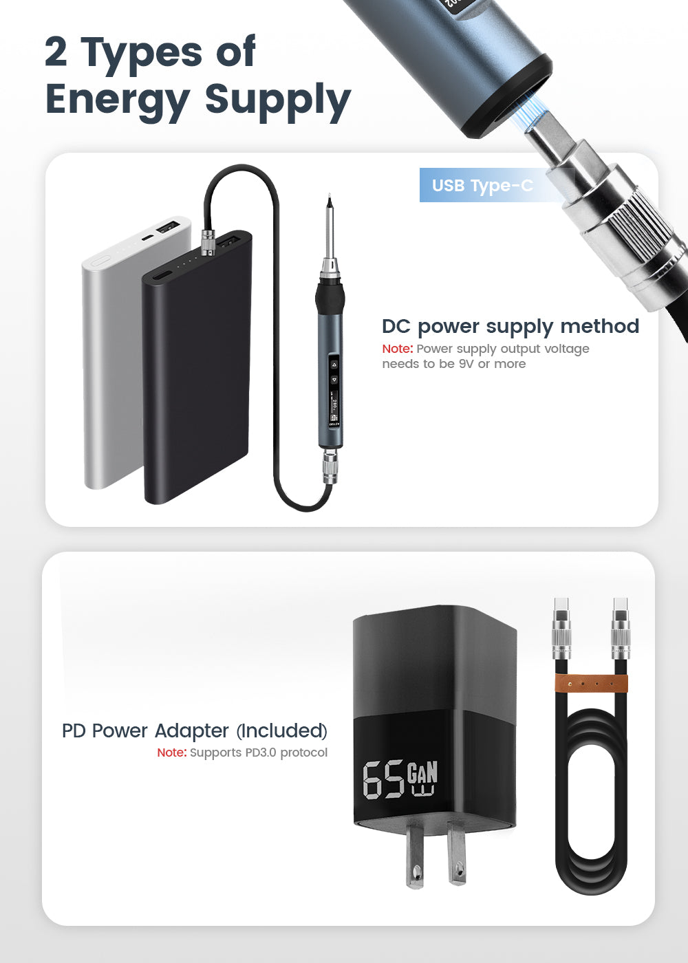 Adjustable Working Voltage: This soldering iron can be set to obtain any of the four working voltages of 9V/12V/15V/20V (default working voltage is 20V), and obtain the corresponding working current, power, and tin melting time under different working voltages. This function can meet the requirements of various working intensities.(Note: It is recommended to use a PD fast charging plug as the power plug for this product, otherwise it may cause insufficient power.)