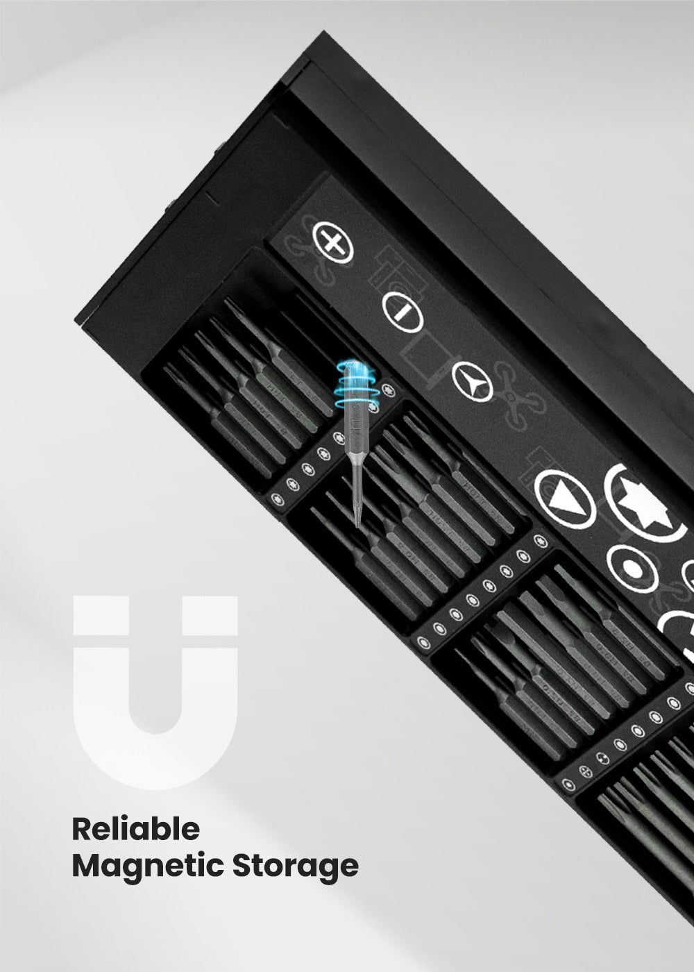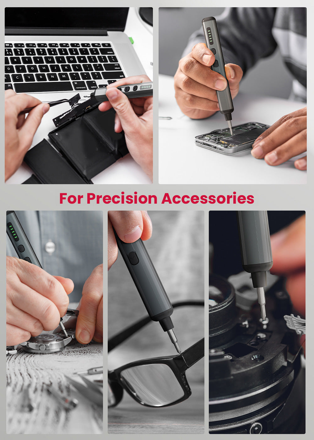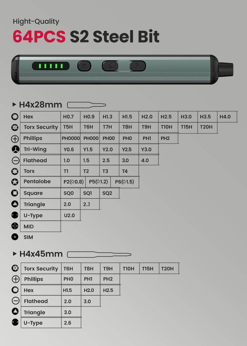 Accessories & Applications: This electric screwdriver kit comes equipped with 64 precision bits, featuring 12 models in 2 lengths, effortlessly handling a variety of screws and holes. It includes an integrated magnetizer, magnetic pad, metal scraper, tweezers, and a USB-C charging cable. Suitable for a range of precision instruments such as smartphones, laptops, cameras, drones, watches, and more.