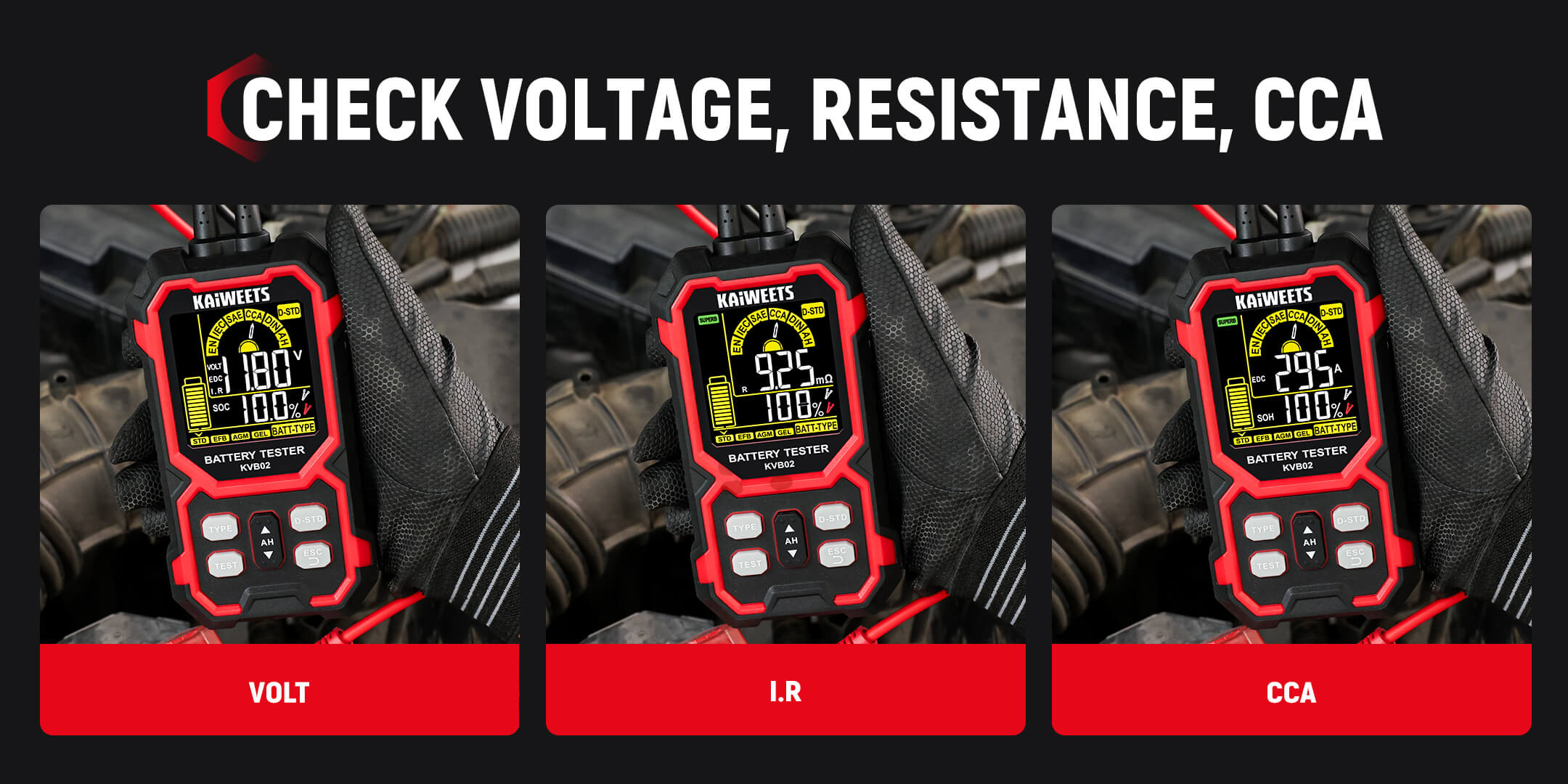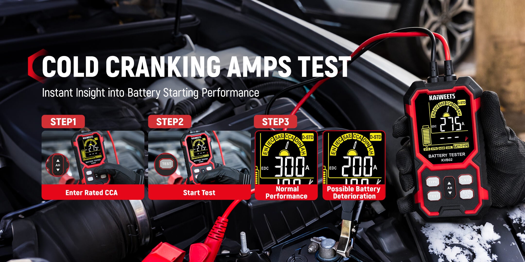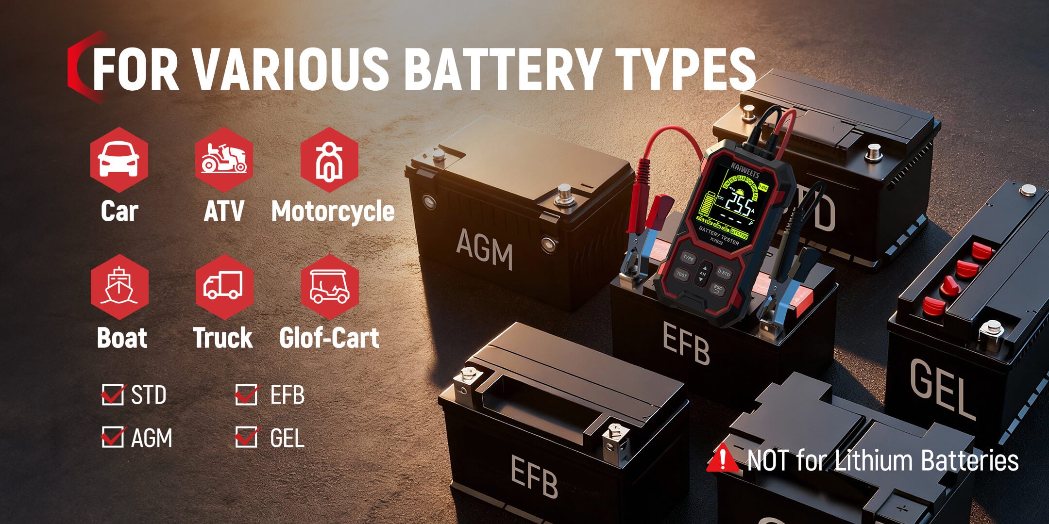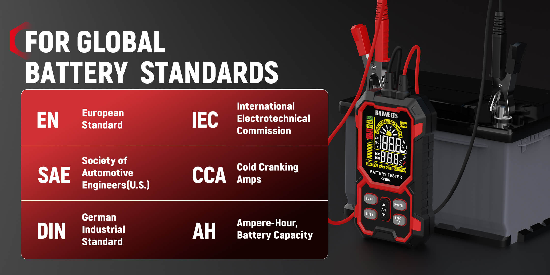 12V/24V Battery Tester: KAIWEETS battery tester works with all 12V and 24V batteries with a cold cranking amp (CCA) rating from 50 to 2000, including Standard (Flooded) Battery, EFB, AGM, and GEL battery types. Ideal for cars, motorcycles, trucks, RVs, ATVs, SUVs, boats, yachts, lawn mowers, and golf carts, it provides reliable, fast, and effortless vehicle battery maintenance.