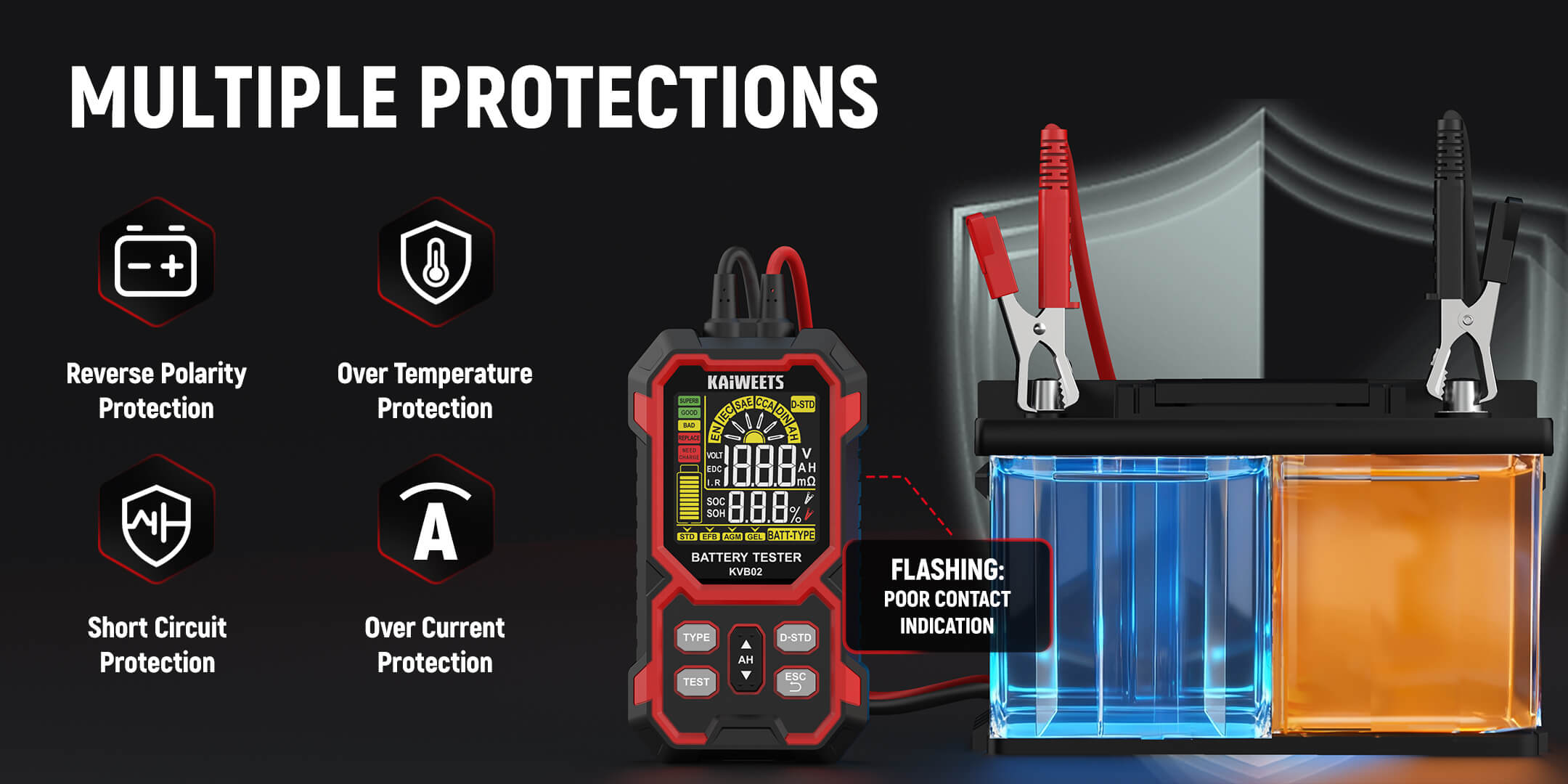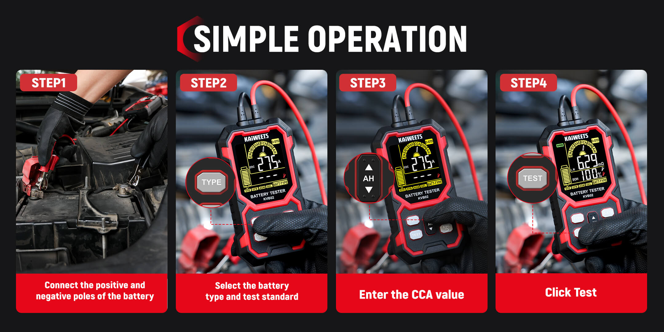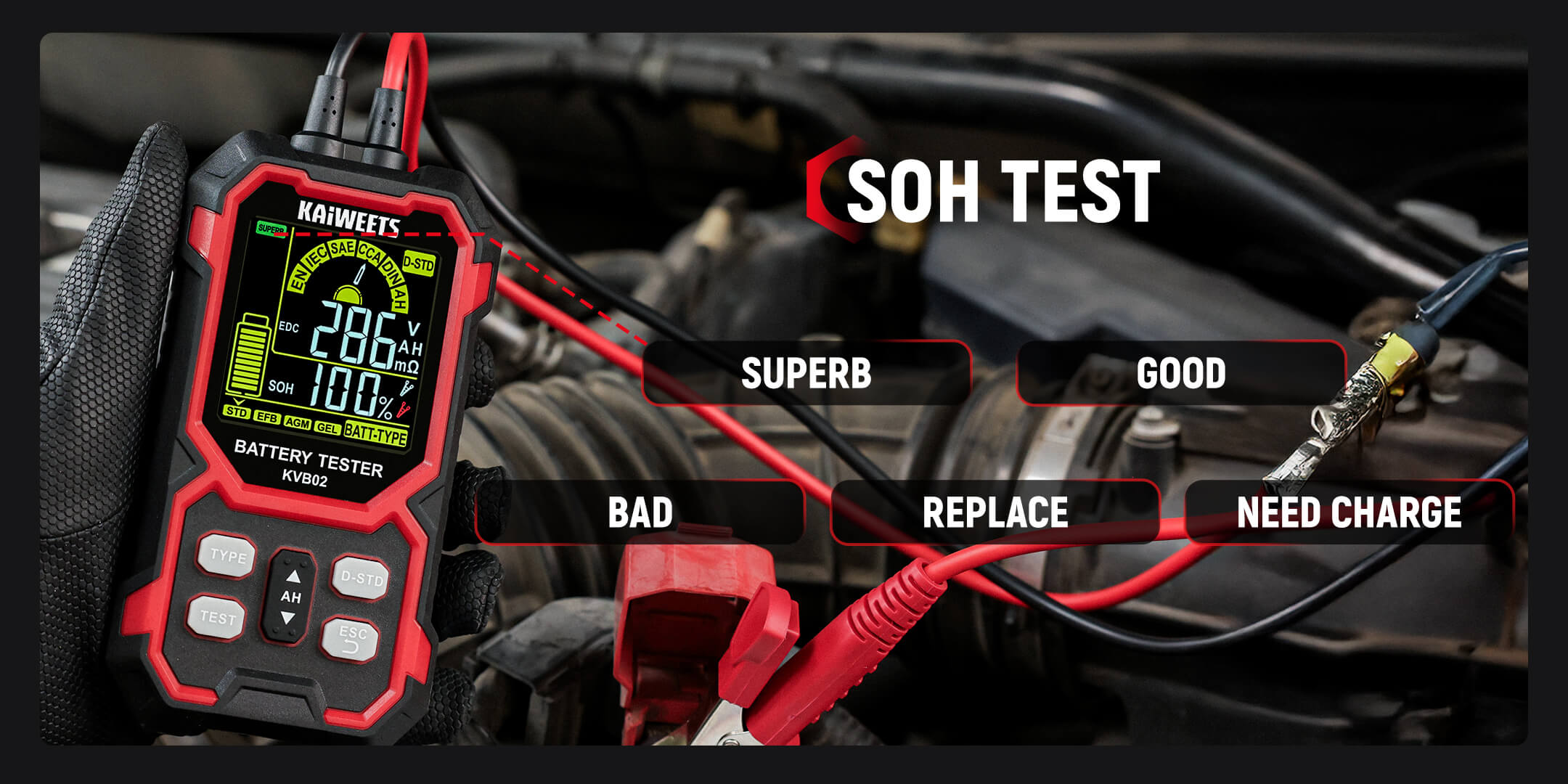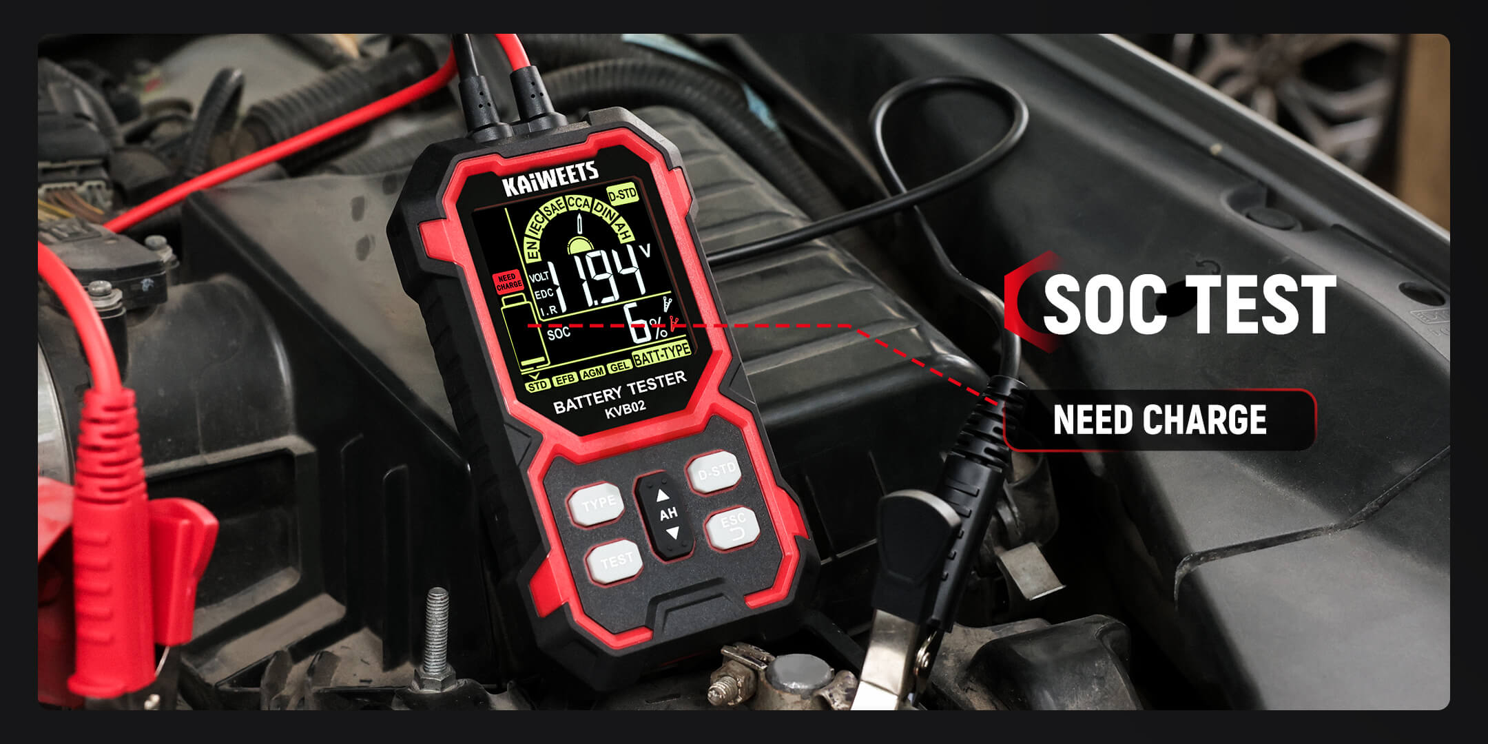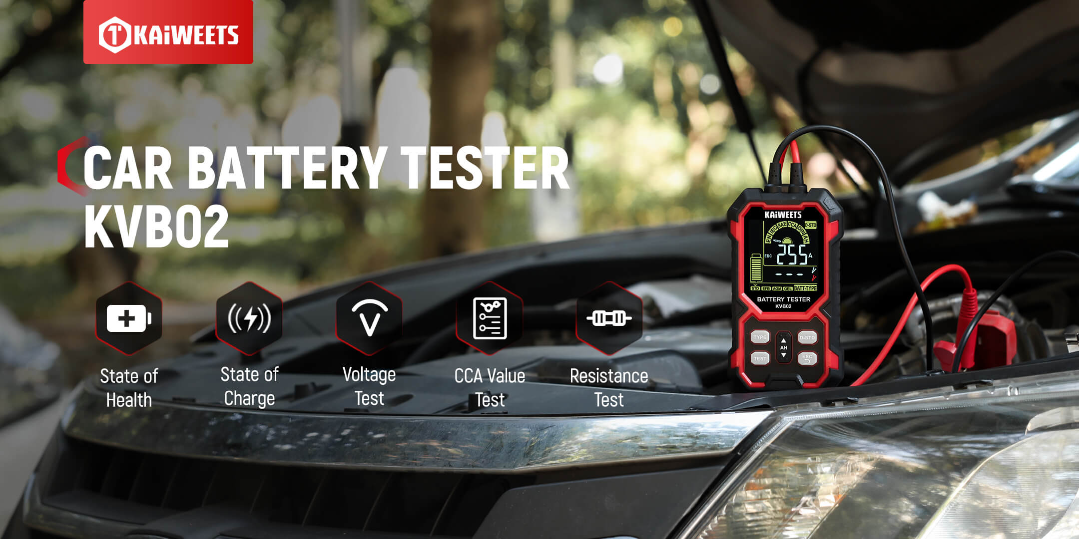 12V/24V Battery Tester: KAIWEETS battery tester works with all 12V and 24V batteries with a cold cranking amp (CCA) rating from 50 to 2000, including Standard (Flooded) Battery, EFB, AGM, and GEL battery types. Ideal for cars, motorcycles, trucks, RVs, ATVs, SUVs, boats, yachts, lawn mowers, and golf carts, it provides reliable, fast, and effortless vehicle battery maintenance.