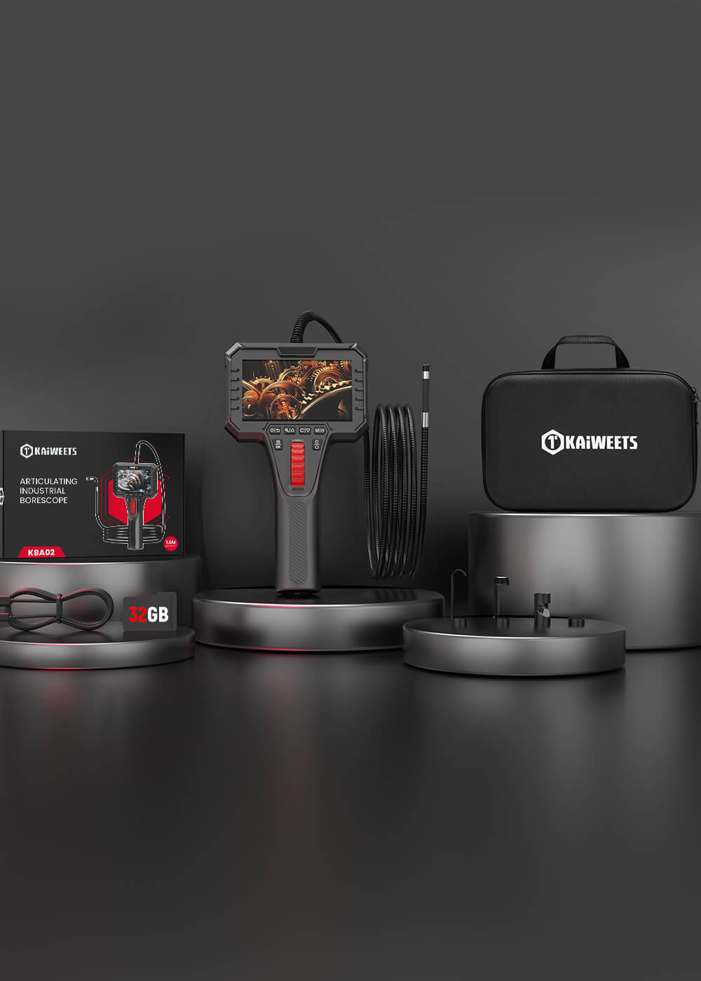 I own several Kaiweets tools and I can speak first hand about their quality and engineering, thats why I was excited to find this articulating borescope. Actually I was a little geeked out when it came, I ve always wanted a good scope that would bend around corners at my command instead of trying to twist the cable into the right spot.This scope has a very good resolution screen and the 7mm cable and head is perfect for those tight little spots we get into working on cars and houses. I really like the dial for moving the probe up and down, its pretty smooth and works very well.Theres so many little engineering and bonus things in this package like it includes a 32gb micro sd card installed and a rechargeable battery that uses a usb C cable included.Everything about this scope screams quality - I love it!Highly recommend especially at this bargain price