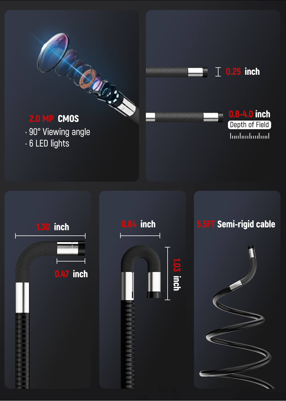 The 0.25-inch ultra-thin probe of this articulating borescope inspection camera easily slips into narrow gaps that standard endoscopes can’t reach. A 2MP lens captures sharp visuals, while six adjustable LED lights illuminate dark environments, letting you fine-tune brightness for optimal visibility. An additional rear-facing flashlight enhances visibility, helping you work efficiently in low-light conditions.