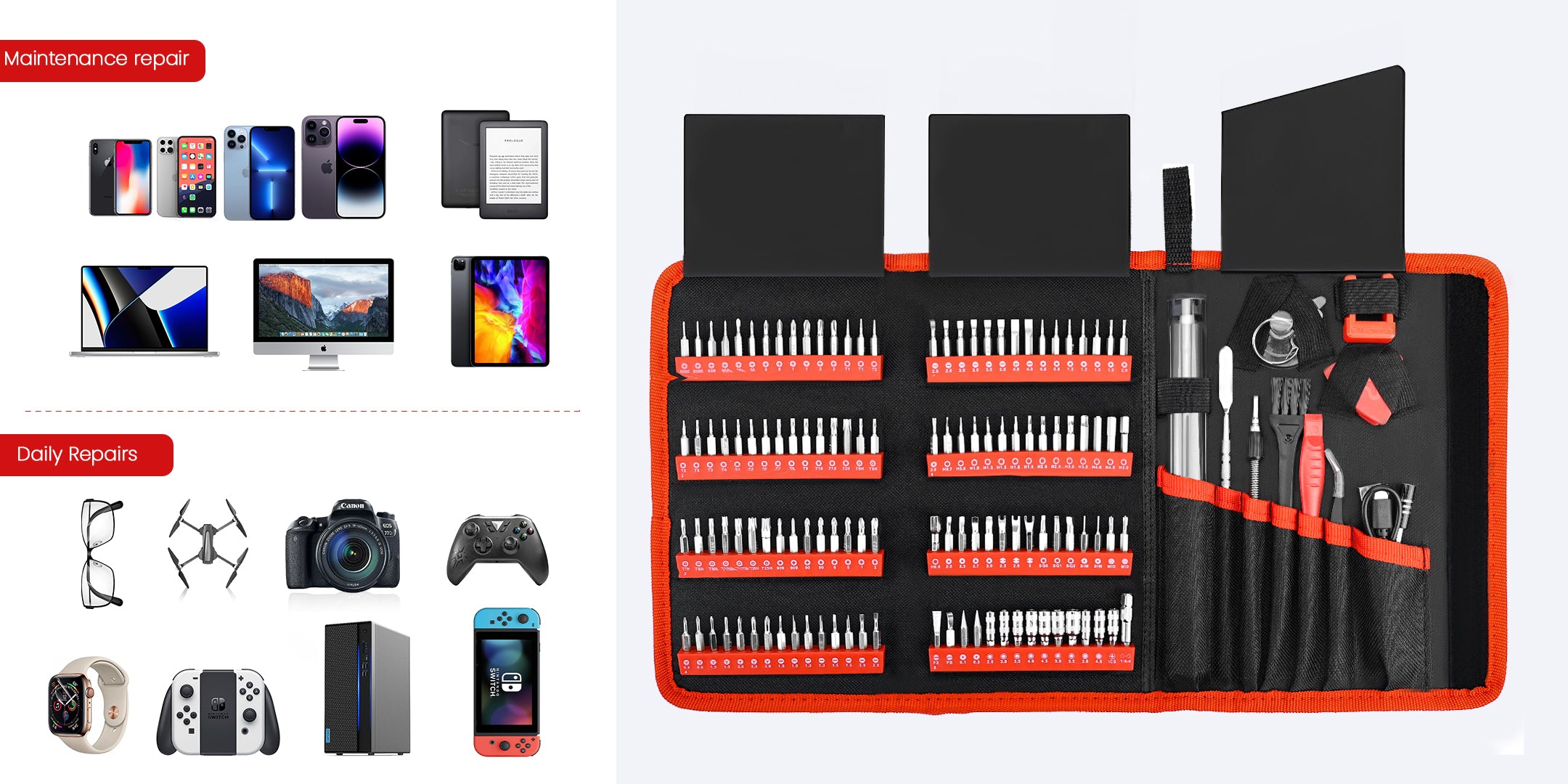 This electric screwdriver set has 137 units: including 120 precision CRV silver nickel bits, 1 Suction Cup with SIM Card Pin, 1 Metal Spudger, 120mm POM Pry Tool, 1 Flexible Extension Shaft, 1 Cleaning Brush, 1 Angled Tweezers, 1 Magnetizer/ Demagnetizer, 1 Electric Screwdriver Handle, 1 Magnetic Mat, 1 USB Cable, 3 Red thin triangle Opening Picks, 3 Red thick triangle Opening Picks, 1H4X55mm Extension Shaft (Assembled in the Screwdriver).