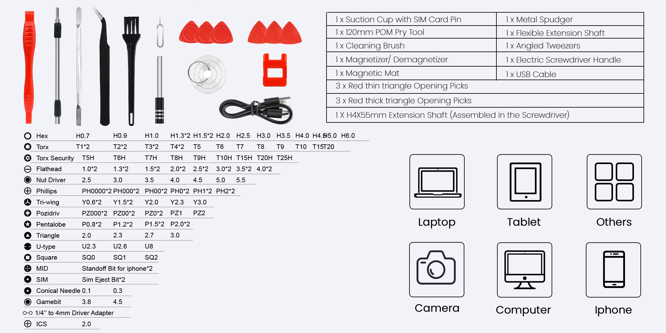 Screwdriver Set 137 in 1: This electric screwdriver set has 137 units: including 120 precision CRV silver nickel bits, 1 suction cup with SIM pin, 1 metal pry bar, 120 mm POM pry tool, 1 flexible extension shaft, 1 cleaning brush, 1 angled tweezer, 1 magnetizer/demagnetizer, 1 electric screwdriver handle, 1 magnetic pad, 1 USB data cable, 1 3 red thin triangle triangle pry pieces, 3 red thick triangle triangle pry pieces, 1H4X55mm extension shaft (assembled in the screwdriver)
