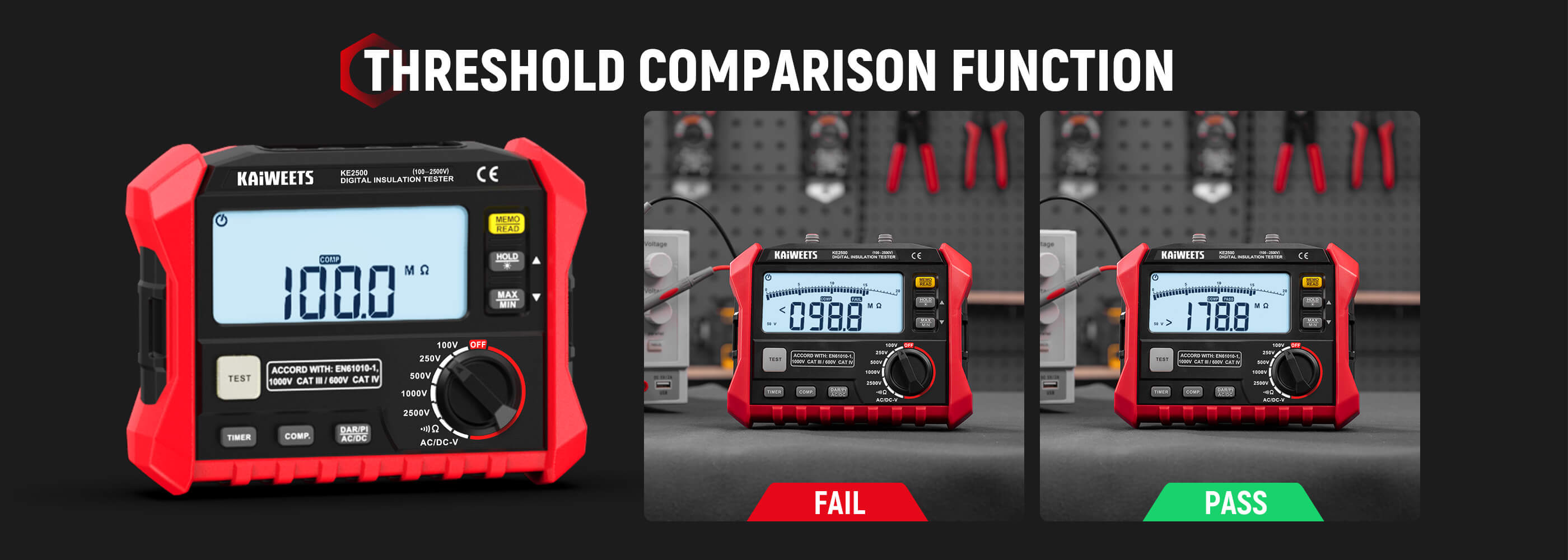 Intelligent PASS/FAIL Evaluation: Customize insulation resistance thresholds as needed; the tester instantly displays "PASS" or "FAIL" based on real-time readings, simplifying quality control and safety verification processes.