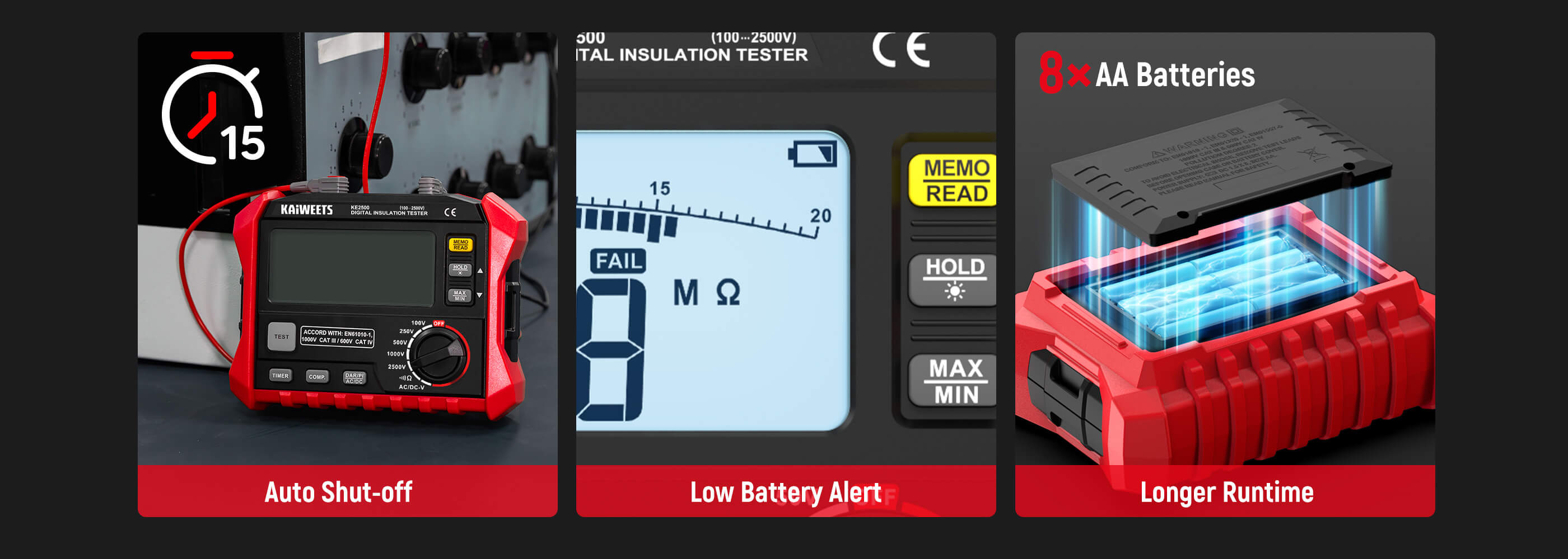 Certified Safety & Durable Build: Fully compliant with IEC/EN 61010-1 CAT III 1000V / CAT IV 600V safety standards, delivering dependable protection for industrial electrical testing scenarios. This tester is equipped with practical utility features: Data Hold, Backlight, 15-minute Auto Shutdown, Continuity Buzzer (activated when resistance <50Ω), and the capability to measure AC/DC Voltage (up to 750V AC / 1000V DC).